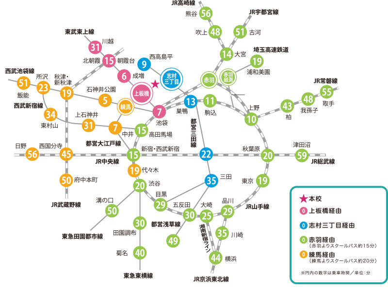 JR赤羽駅西口と都営大江戸線・西武池袋線・東京メトロ練馬駅北口からスクールバスを運行しています。校舎内にスクールバスロータリーを併設しており、安全で快適な通学環境となっています。