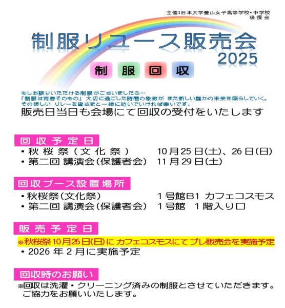 豊山女子後援会(PTA)主催で,在校生・卒業生による制服リユース活動を始めます。ご家庭のご負担軽減と環境配慮の両立を目的とし,継続的な取り組みとして位置づけています。回収予定日は10/25(土)26(日)に開催する秋桜祭(文化祭),11/29(土)保護者講演会です。販売は秋桜祭2日目10/26(日)にプレ販売を予定しています。皆様のご理解とご協力をどうぞよろしくお願いいたします。